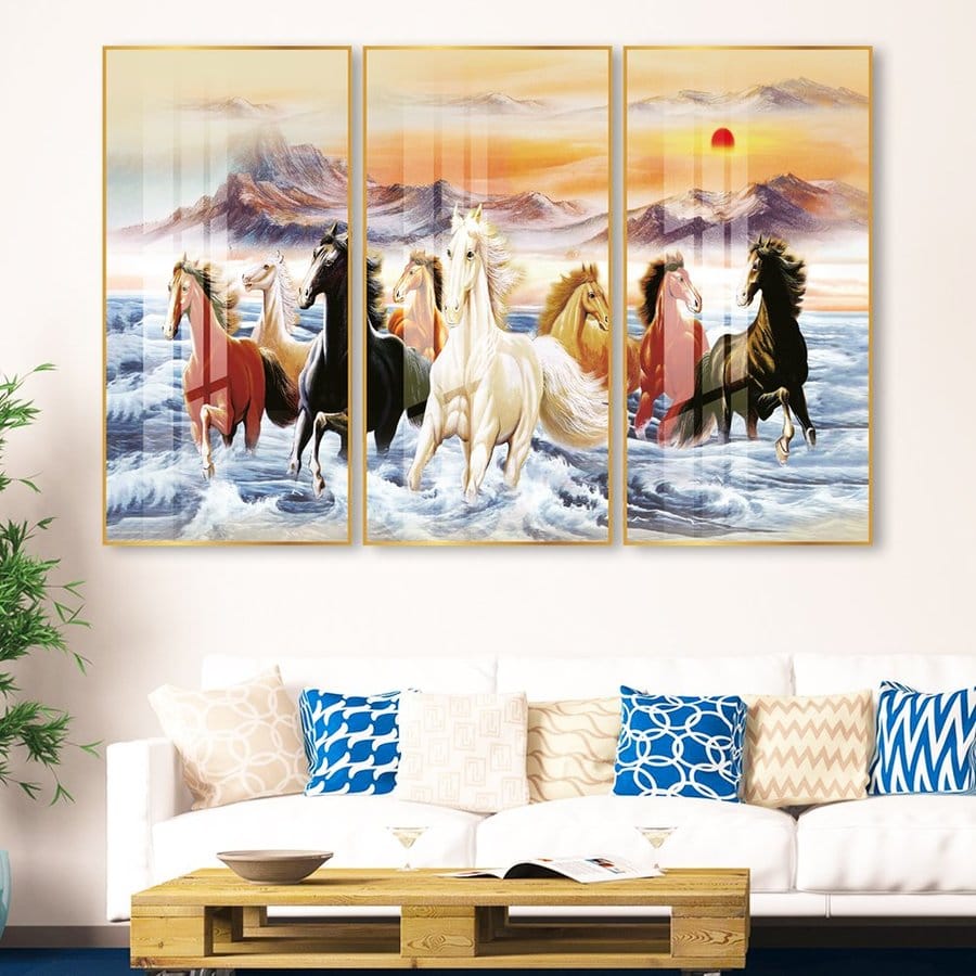- Trang trí phòng khách sang trọng: Màu sắc hài hòa, hình ảnh ngựa mạnh mẽ tạo điểm nhấn tinh tế.